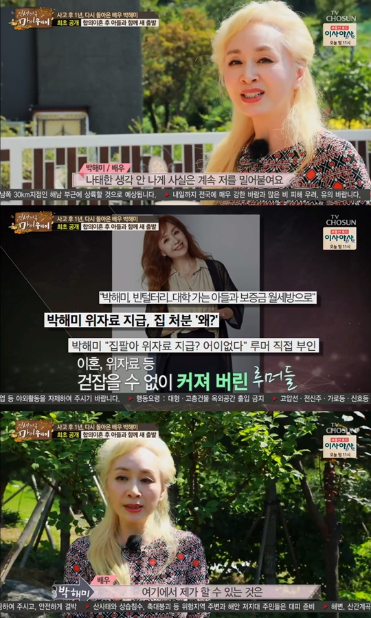박해미는 ‘집 팔아 위자료 마련한다’는 루머를 해명했다. 박해미는 “솔직히 다 정리하고 싶었다. 집을 내놨는데 쉽게 팔리지 않더라”라고 설명했다. 박해미는 “지금은 집만 있고 재산은 없는 상황이다. 집은 몸만 기거하는 중이다. 앞으로 채워나갈 거다”고 굳게 다짐했다.