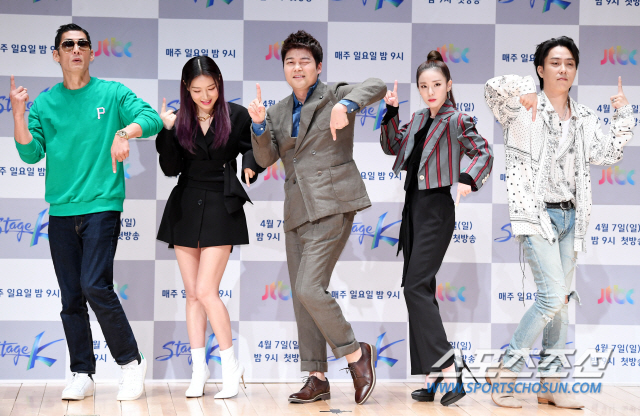 JTBC 예능 '스테이지K' 제작발표회가 2일 오후 서울 상암동 JTBC사옥에서 열렸다. 박준형, 유빈, 전현무, 산다라박, 은지원이 포즈를 취하고 있다. '스테이지K'는 다양한 국적의 출연자들이 케이팝 댄스 국가대항전을 벌이는 프로그램이다. MC 전현무와 박준형, 은지원, 산다라박, 유빈이 K-리더스로 출연한다. 정재근 기자 cjg@sportschosun.com/2019.04.02/