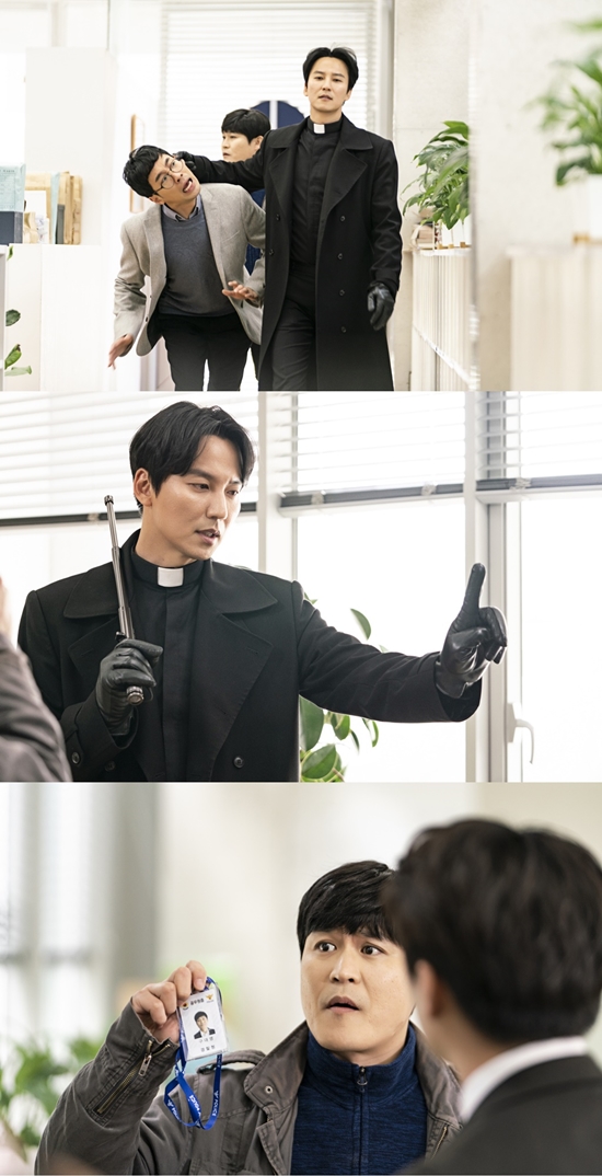 김해일과 구대영의 모습도 시선을 사로잡는다. 사제 김해일은 '성령을 깡으로 받았나'라는 말을 들을 정도로 거침없다. 김해일은 삼단봉 하나를 어깨에 툭 걸쳤을 뿐인데, 카리스마가 넘쳐 흐른다. 그 옆에서 형사증을 자랑스럽게 꺼내든 구대영은 '열혈 형사 모드'에 빠져 있다. 겁쟁이에서 의욕 넘치는 형사로 거듭난 구대영의 모습이 흐뭇함을 자아낸다. 두 사람의 케미에 이목이 모인다.