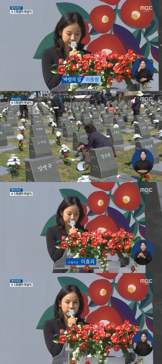 당시 이효리는 문재인 대통령 내외, 여야 정당 대표, 유족 등이 참석한 가운데 검은색 정장을 입고 단상에 올라 내레이터 역할을 했다. 차분한 목소리로 이종형의 '바람의 집'을 낭독했고, 이은미는 '찔레꽃'을 열창했다.