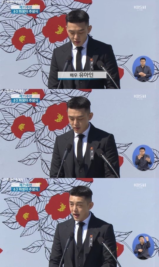 유아인은 4월 3일 오전 10시 제주 4.3 평화공원에서 진행된 '제71주년 제주 4·3 희생자 추념식'에 참석했다. 이날 추념식 현장은 KBS 1TV를 통해 생중계됐다.