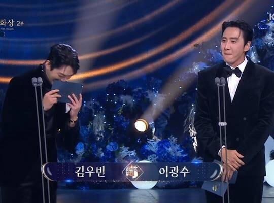 이날 감독상 발표 시상자로 배우 김우빈과 이광수가 나섰다. 두 사람은 예능적인 케미를 발휘하며 즐겁게 등장해 눈길을 모았다. 특히 이광수의 등장에 오랜 연인이 이선빈의 모습이 카메라에 클로즈업 돼 눈길을 끌었다.