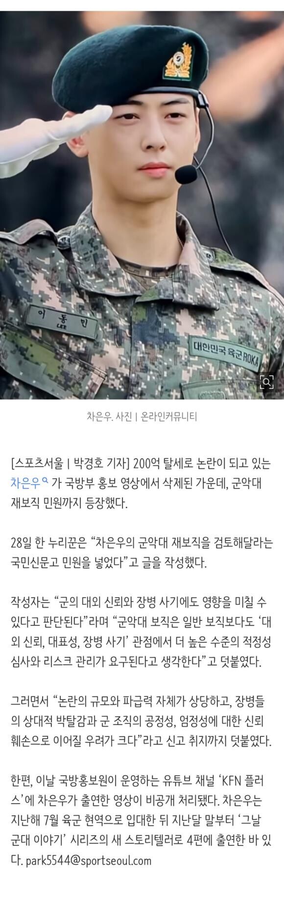 차은우, 군대서도 쫓겨나나..군악대 재보직 검토 민원 등장