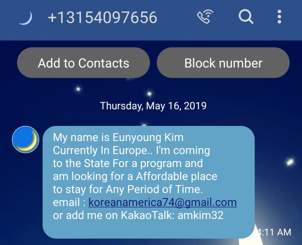 My name is Eunyoung Kim Currently In Europe.. I'm coming to the State For a program and am looking for a Affordable place to stay for Any Period of Time. email :