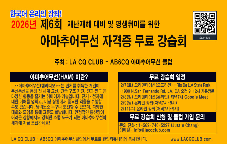 한인 아마추어무선 클럽인 LA CQ CLUB에서 아마추어무선 시험을 위한 무료 강의를 진행 합니다.