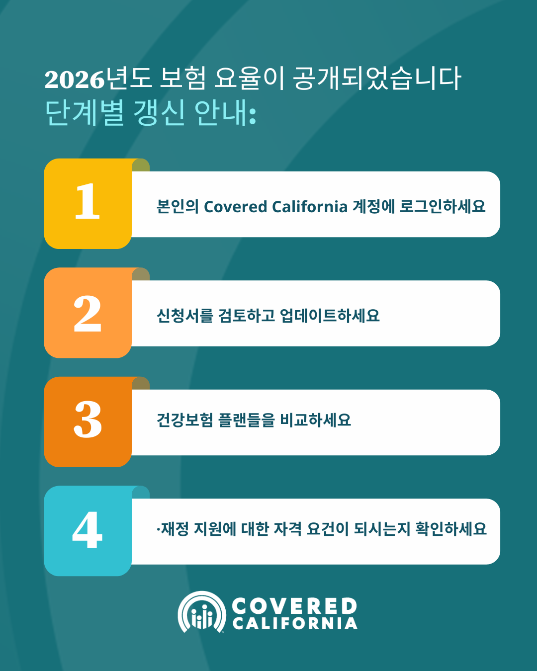 달력에 표시해 두세요! @CoveredCA 갱신 시즌이 10월 15일에 시작되었습니다. 현재 Covered California를 통해 건강보험 플랜에 가입되어 있으시다면, 지금이 다양한 옵션을 검토하고 여러분과 가족에게 가장 잘 맞는 건강보장을 확인할 시기입니다.