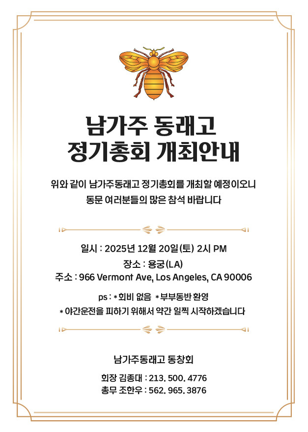 위와 같이 남가주동래고 정기총회를 개최할 예정이오니