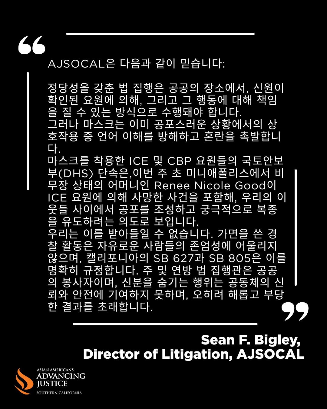 주정부와 연방정부의 법 집행관은 시민을 위해 봉사하는 공공의 존재입니다. 신분을 숨기는 행위는 공동체에 도움이 되지 않습니다. 이는 해롭고 부당합니다.