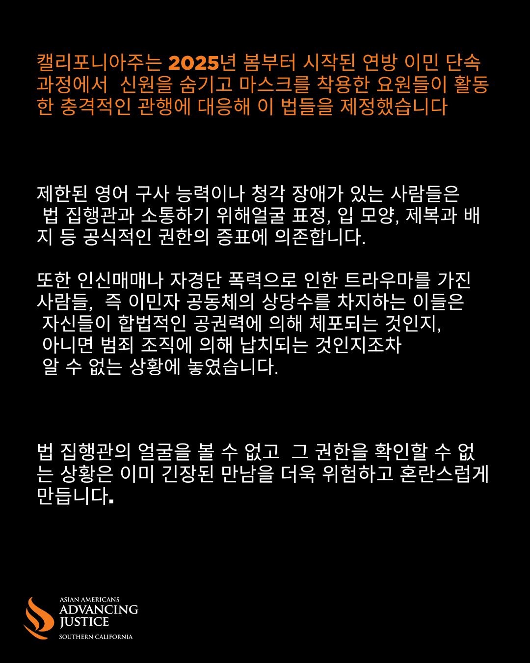 법 집행관이 배지를 숨기고 얼굴을 가리며 신분 표식을 감출 경우, 제한된 영어 구사 능력을 가진 주민, 청각 장애가 있는 분들, 과거의 트라우마를 겪은 분들은 자신이 마주한 이들이 합법적인 공권력인지 범죄자인지조차 판단하기 어려운 상황에 놓이게 됩니다.