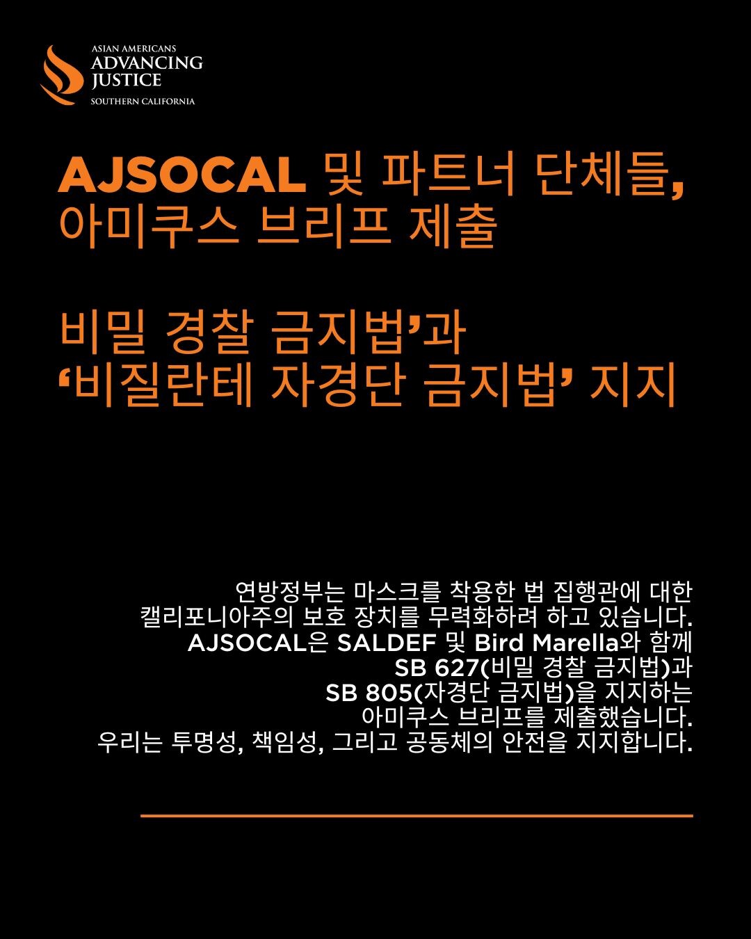 이러한 문제의식에 따라 AJSOCAL은 SALDEF, Bird Marella와 함께 투명성, 책임성, 그리고 명확한 신원 식별을 요구할 수 있는 캘리포니아의 권리를 지지하는 아미쿠스 브리프를 제출했습니다.