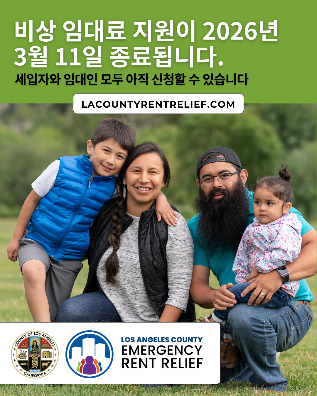 임대인은 밀린 임대료 보상 지원을 받을 수 있습니다. 세입자가 화재, 폭풍, 또는 재정적 어려움으로 연체하고 있다면, 최대 6개월의 임대료 지원을 받을 자격이 있을 것입니다. LACountyRentRelief.com에서 프로그램이 마감되기 전에 신청하세요.