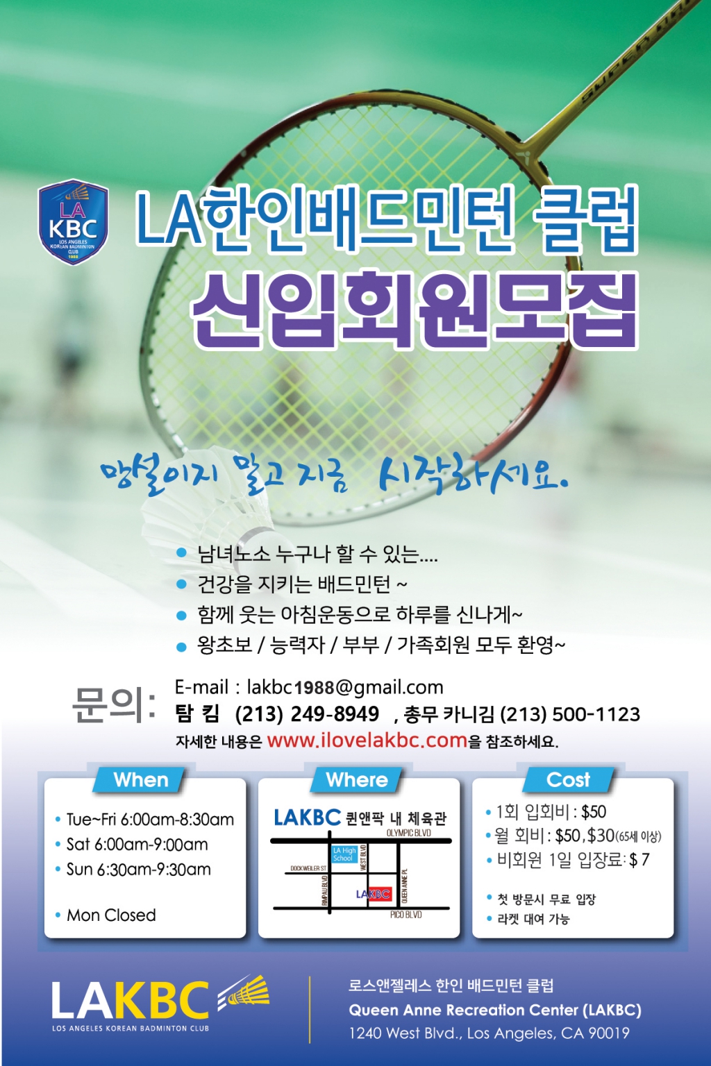 31년 역사의 한인배드민턴 클럽 LAKBC에서 회원모집 기간 중