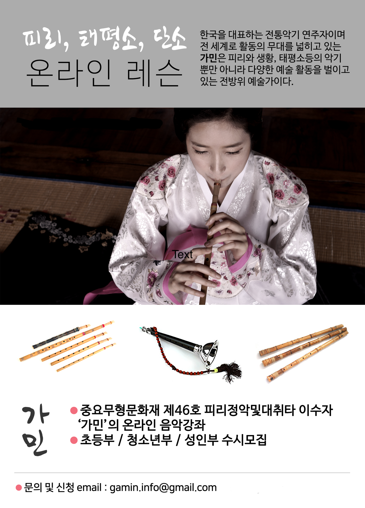 단소, 피리, 태평소, 장구, 사물놀이, 등 국악합주