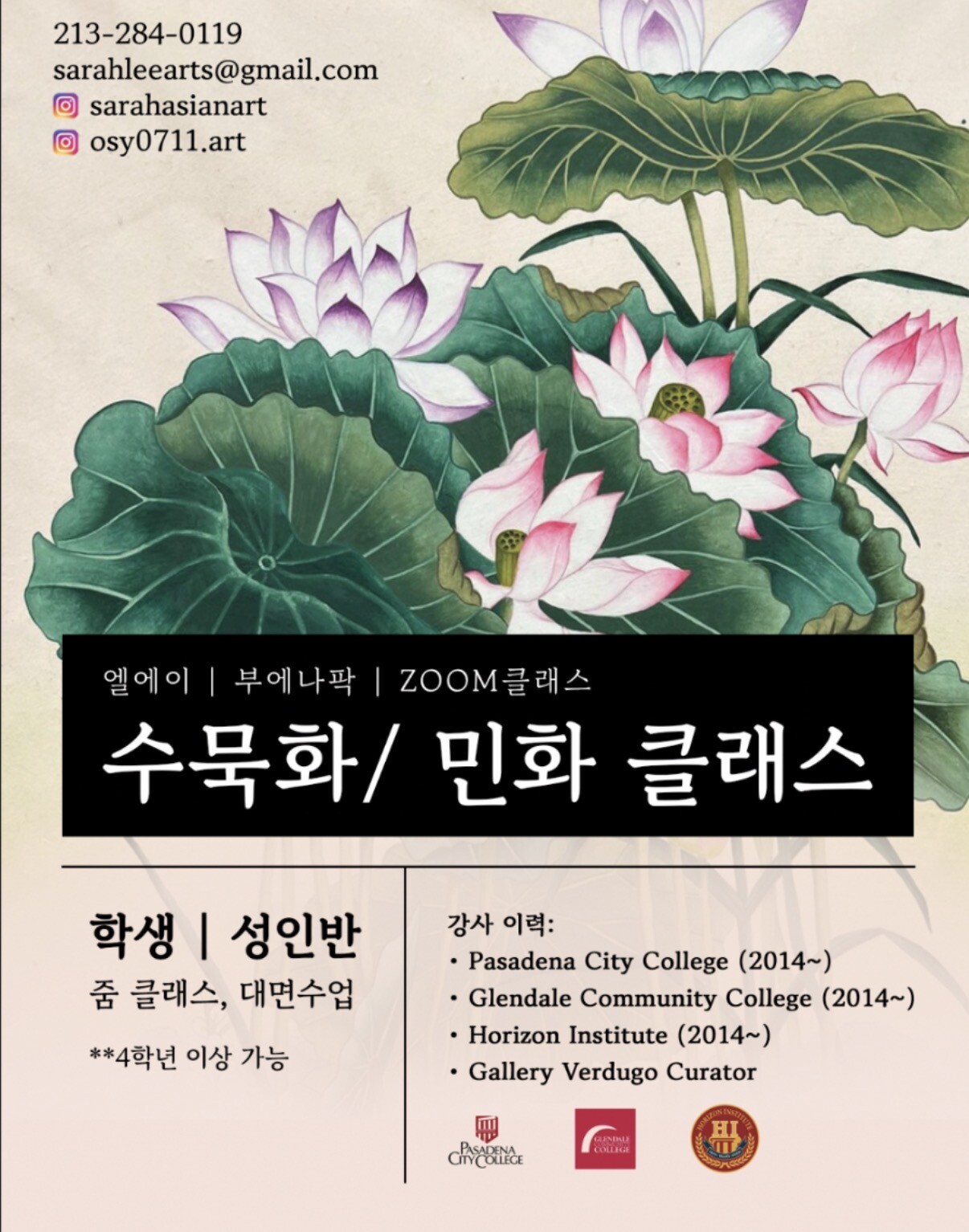 현재 Pasadena City College Extension (PCC) 와 한국교육원에서 수묵화와 민화를 강의 중이며, 초보자부터 경험자까지 누구나 따뜻하고 편안한 분위기에서 자신만의 작품을 완성할 수 있도록 도와드립니다.