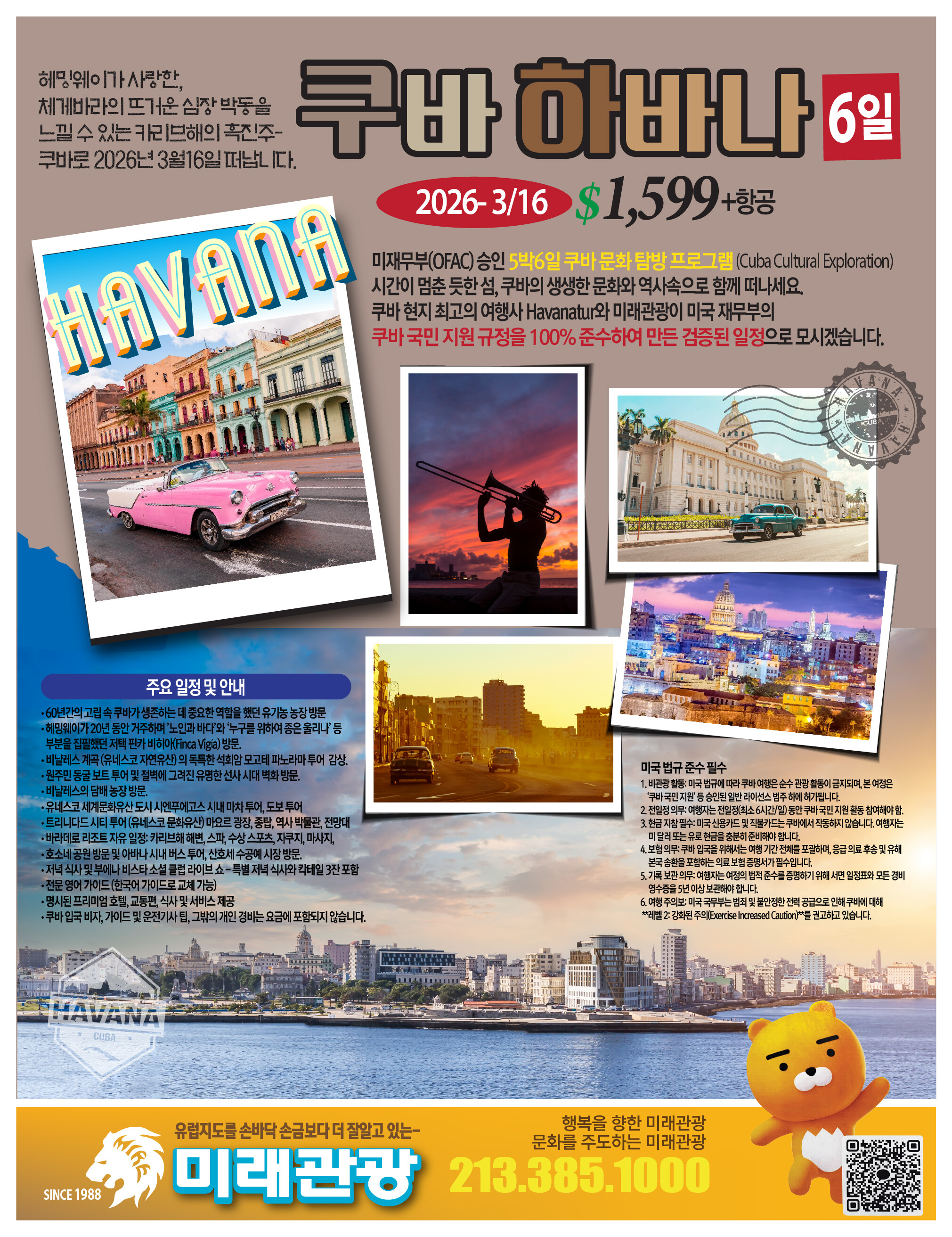 미재무부 (OFAC) 승인 쿠바 하바나 5박6일 문화탐방 20분만 모시겠습니다.