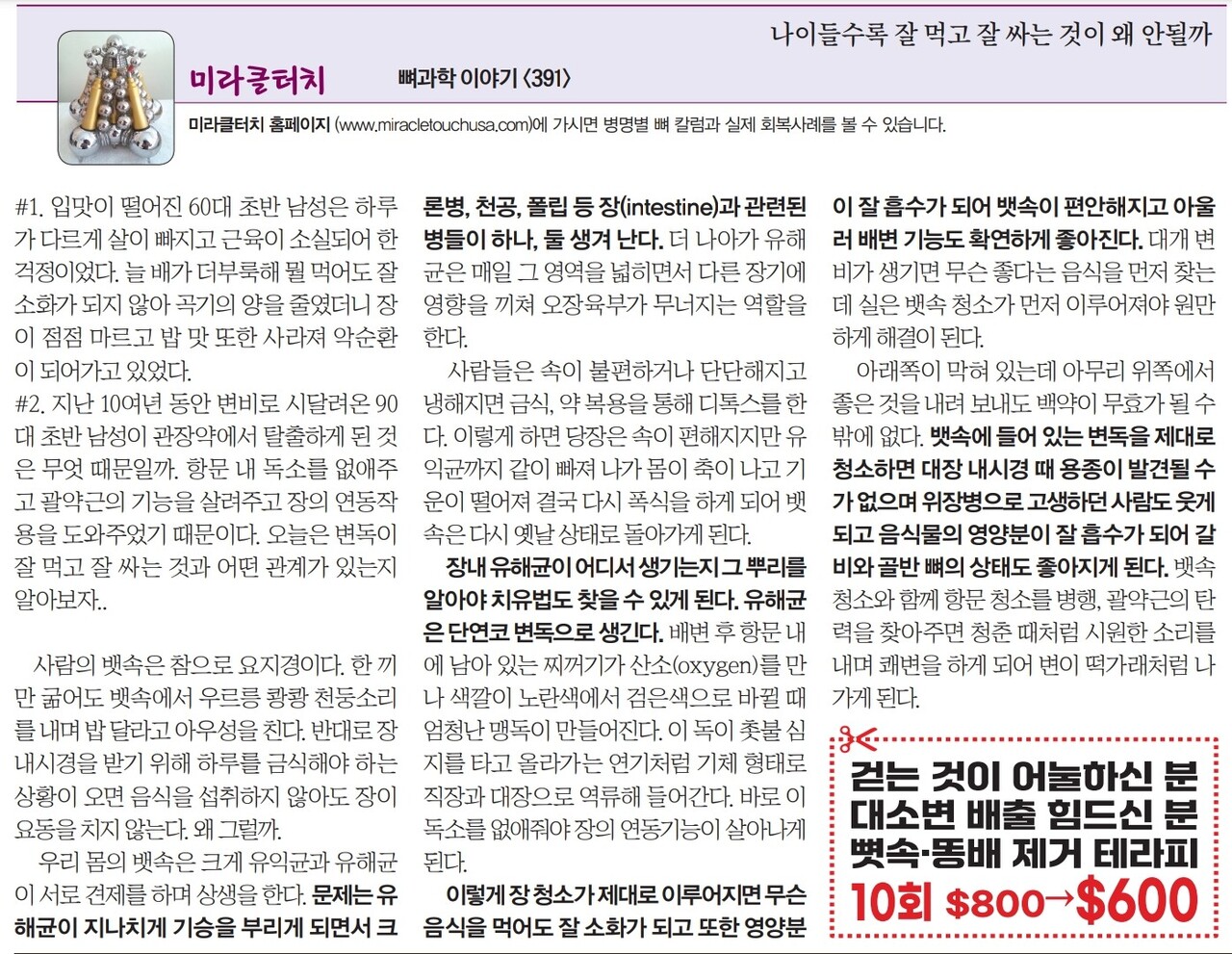 #2. 지난 10여년 동안 변비로 시달려온 90대 초반 남성이 관장약에서 탈출하게 된 것은 무엇 때문일까. 항문 내 독소를 없애주고 괄약근의 기능을 살려주고 장의 연동작용을 도와주었기 때문이다. 오늘은 변독이 잘 먹고 잘 싸는 것과 어떤 관계가 있는지 알아보자..