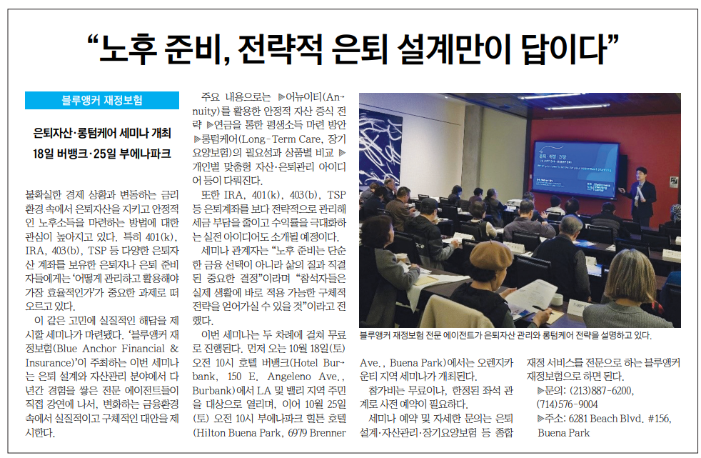 불확실한 경제 상황 속에서 은퇴자산을 지키고 안정적인 노후를 준비하는 전략이 필요합니다. 블루앵커 재정보험의 모니카 김 재정전문가는 401(k), IRA, TSP 등 은퇴자산을 보다 효율적으로 관리하고, 어뉴이티(Annuity)를 통한 평생소득 전략과 장기요양(Long-Term Care) 대비 방안을 주제로 세미나를 진행합니다. 이번 세미나는 은퇴자산을 안정적으로 증식시키는 다양한 방법과 맞춤형 은퇴 설계 아이디어를 공유하는 자리로, 전문가의 실제 사례와 구체적인 전략을 통해 은퇴 준비의 방향을 제시합니다. 세미나는 10월 18일 부에나팍, 10월 25일 버뱅크에서 각각 열리며, 사전 예약이 필요합니다. (문의: 213-448-4246 모니카 김)