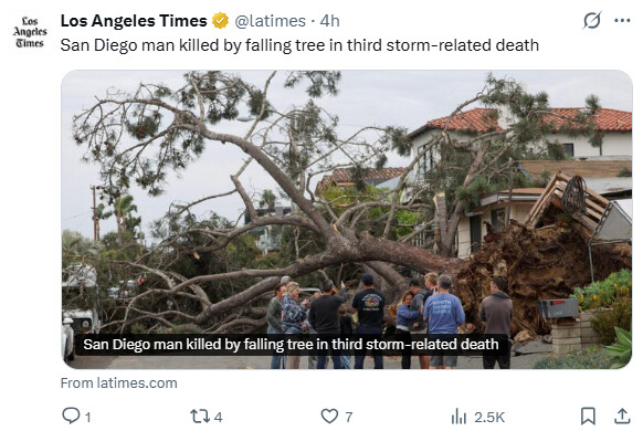 남가주를 강타한 폭풍으로 인한 인명 피해가 또 발생했다. 샌디에고 경찰국에 따르면, 어제(24일) 오전 샌디에고에서 64살 남성이 쓰러진 나무에 깔려 숨지고 말았다. 이번 사망은 크리스마스 연휴 기간 캘리포니아주를 강타한 폭풍과 관련된 세 번째 사망 사례다. 사고는 어제 오전 10시 55분쯤 샌디에고 시티 하이츠 지역 말버러 애비뉴 인근에서 발생했다. 샌디에고 지역 언론은 높이 약 75피트에 달하는 대형 나무가 인도 위로 쓰러졌다고 보도했다. 유가족은 NBC 샌디에고에 숨진 남성의 이름이 로베르토 루이스라며, 집 앞에 세워둔 차량을 옮기기 위해 잠시 밖으로 나왔다가 나무 일부가 무너지며 변을 당했다고 전했다. 앞서 지난 일요일에는 북가주 레딩에