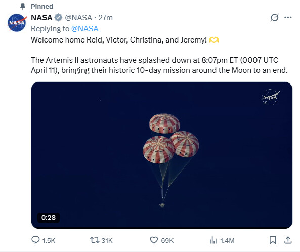 유인 우주탐사선 '아르테미스 2호'가 달 탐사를 마치고 지구로 귀환했다. 연방 항공우주국NASA에 따르면 오늘(10일) 오후 5시 7분 '아르테미스 Ⅱ'의 유인 캡슐인 오리온이 샌디에고 인근 바다에 착수했다. 지난 1일 플로리다주 케네디 우주 센터에서 발사된 지 열흘 만이다. '…