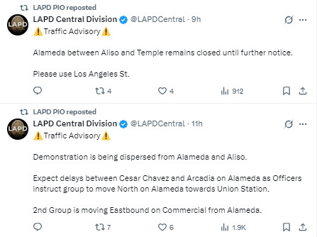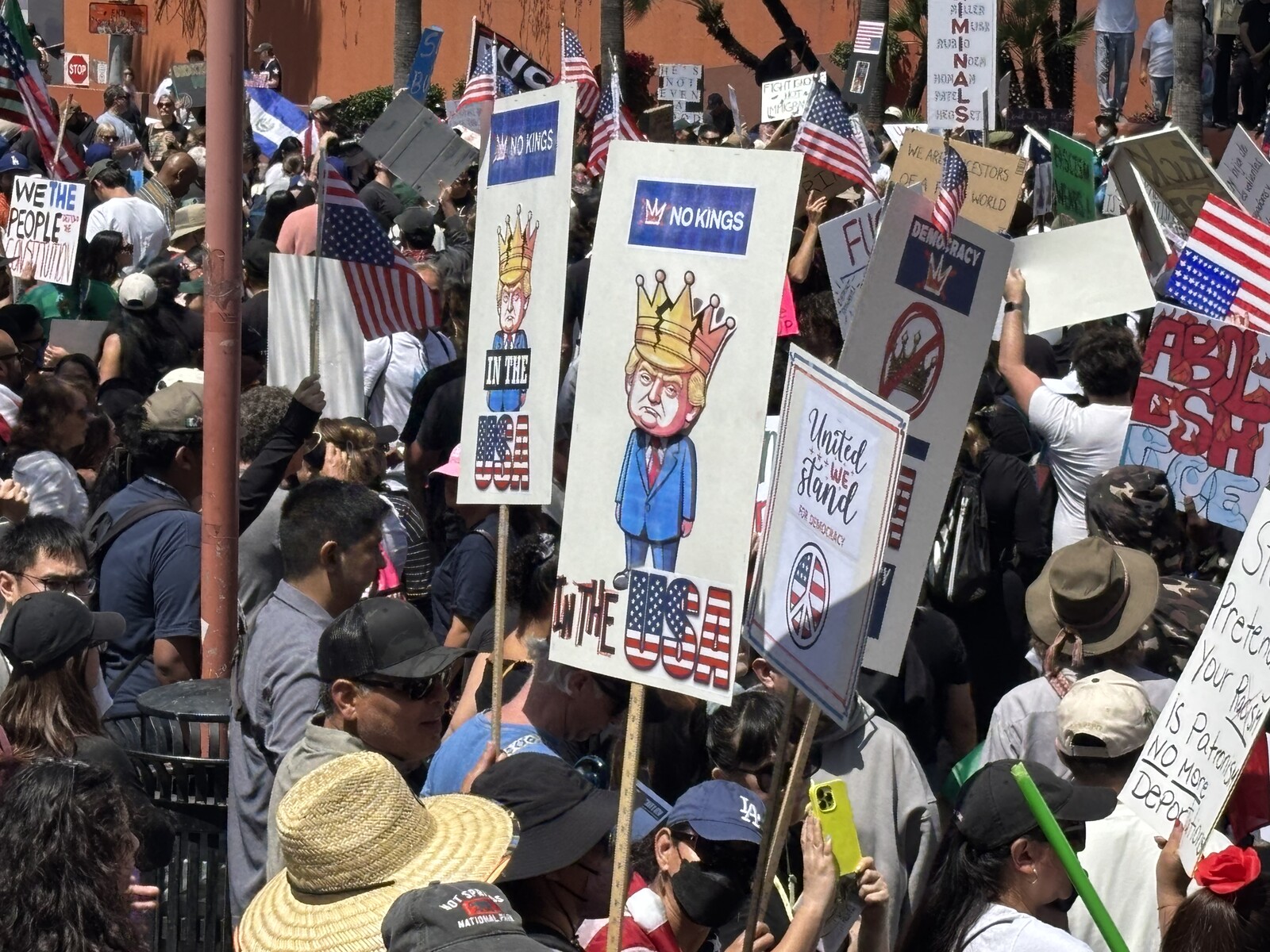 어제(18일) 전국적으로 도널드 트럼프 대통령 국정 운영 방식에 항의하는 노킹스 시위가 열린 가운데 LA시에서도 수천 명이 거리로 나와 시위를 벌였다. SoCal50501과 SEIU721, Black Lives Matter Grassroots 등 다수의 단체들이 참여했다. 시위 참여자들은 LA시청 인근에서 스프링 스트릿을 따라 약 2마일 구간에서 행진을 이어가며 도널드 트럼프 행정부의 국정 운영 방식에 대한 반대 구호를 외쳤다. 이번 시위에도 기저귀를 찬 도널드 트럼프 대통령의 모습을 형상화한 20피트 높이의 대형 풍선이 어김없이 등장했다. 또 'No Kings for US' 라고 적힌 20피트 높이의 대형 피켓도