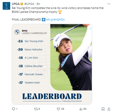김세영이 약 5년 만에 미국여자프로골프 LPGA 투어에서 우승컵을 들어 올렸다. 김세영은 19일 전남 해남군 파인비치 골프링크스에서 열린 LPGA 투어 BMW 레이디스 챔피언십 넷째 날 4라운드에서 버디 6개, 보기 1개를 합해 5언더파 67타를 적어내 최종 합계 24언더파 264타로 2위 하…