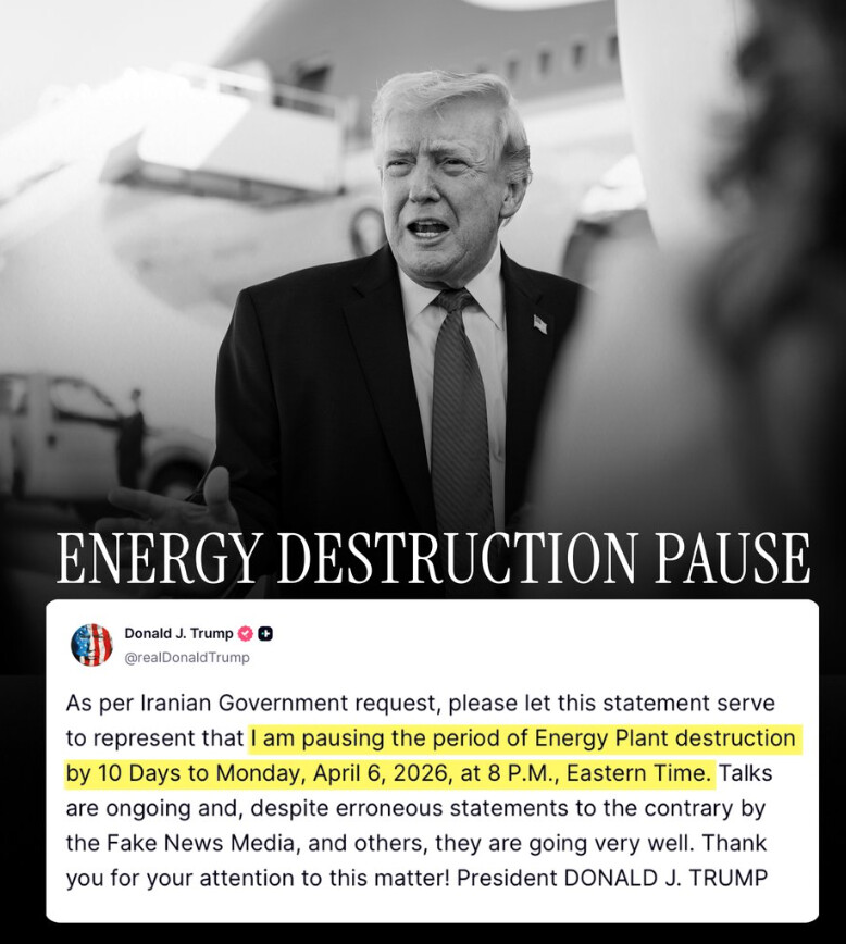 도널드 트럼프 대통령이 또 다시 열흘간 이란의 발전소 등 에너지 시설에 대한 공격을 하지 않겠다고 선언했다. 트럼프 대통령은 오늘(26일) 소셜미디어를 통해, 이란 정부의 요청에 따라 발전소 등 에너지 인프라에 대한 공격을 미 동부시간 기준 4월 6일 저녁 8시까지 10일간 중단한다고 밝혔다. 트럼프 대통령은 "가짜 뉴스 매체와 다른 이들이 잘못된 주장을 하고 있지만, 현재 대화가 진행 중이고 아주 잘 되고 있다"고 강조했다. 이번 조치는 기존 닷새간의 유예 기간이 끝나기 하루 전, 추가로 시한을 연장한 것으로, 협상 국면을 유지하며 외교적 해법을 모색하려는 의도로 풀이된다. 트럼프 대통령은 지난 23일 이란과 협상을 진행 중이라며 27일까지 5일간 발전소와 에너지 시설에 대한 공격을 유예하겠다고 밝힌 바 있다.