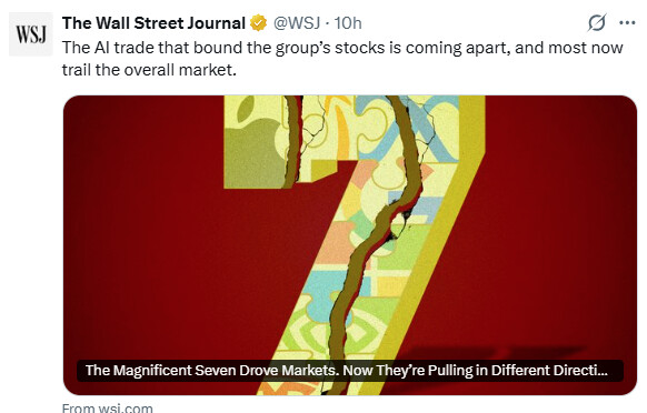 미국 증시를 이끌어온 대형 기술주 그룹, 이른바 ‘매그니피센트7’의 위상이 흔들리고 있다는 분석이 나왔다. 매그니피센트7은 엔비디아, 알파벳, 마이크로소프트, 메타 플랫폼, 애플, 아마존, 테슬라 등 7개 초대형 기술주를 가리킨다. 월스트리트저널은 어제(18일) 이들 …