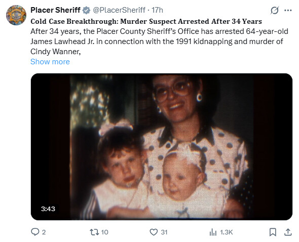 지난 1991년 북가주 세크라멘토 인근 그라니테 베이(Granite Bay)에 위치한 주택에서 신디 워너(Cindy Wanner)를 납치된 뒤 살해한 용의자가 전격 체포됐다. 무려 34년만이다. 플래서 카운티 셰리프국 미제 사건(Cold Case) 전담팀은 숨진 신디 워너 살해 용의자를 올해 64살 제임스 로…