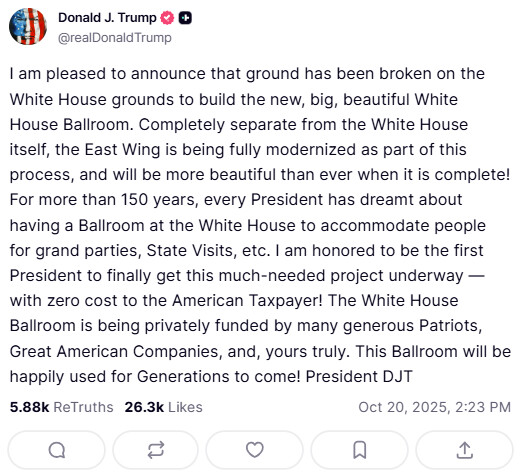 도널드 트럼프 대통령이 어제(20일) 백악관 내 대형 연회장을 착공했다고 밝혔다. 공사비 2억5천만 달러 규모의 대형 연회장을 지으려는 도널드 트럼프 대통령의 오랜 꿈을 이루기 위해 백악관 이스트윙은 철거 작업에 들어갔다. 도널드 트럼프 대통령은 어제(20일)SNS 트루스…
