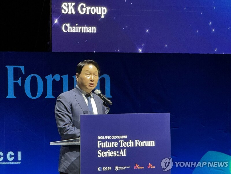 최태원 SK그룹 회장이 28일 경북 경주시 경주엑스포대공원 문무홀에서 열린 '퓨처테크포럼 AI'에서 'AI 생태계 구축'을 주제로 환영사를 하고 있다.
