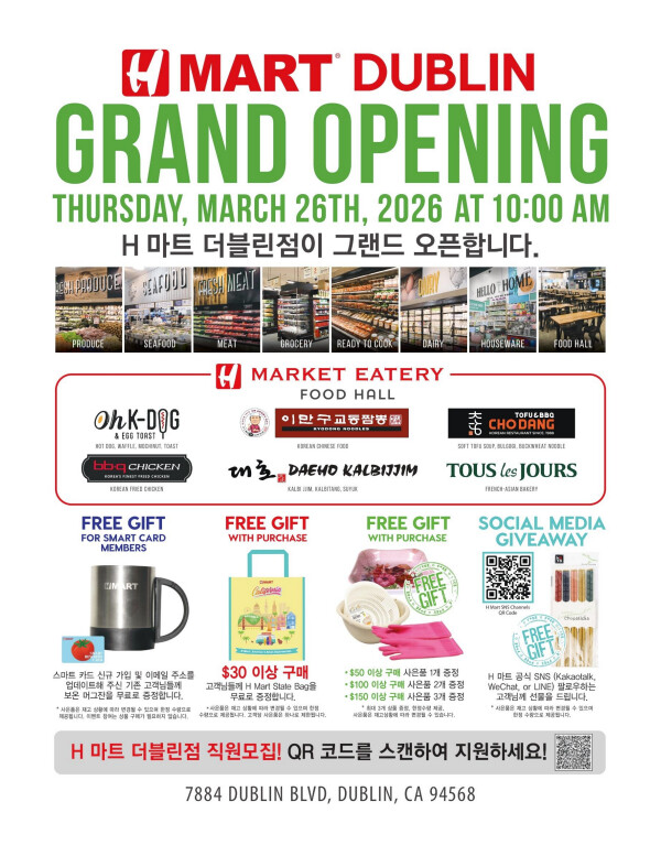 H마트가 북가주 더블린점을 오는 오는 26일 목요일 오전 10시에 공식 개점한다. H마트 더블린점(7884 Dublin Blvd)은 매장의 면적은 약 3만 7천 252 스퀘어피트로 운영된다. 매장 운영시간은 매일 아침 8시부 터 밤 10시까지 연중무휴로 운영된다. 셰리 후(Sherry Hu) 더블린 시장은 …