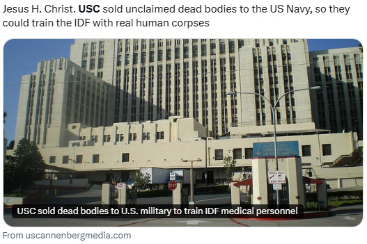 USC가 美 해군에 수십 구의 인간 사체(Cadavers)를 판매했으며, 이 사체들 중 일부가 이스라엘 국방군(IDF) 의료팀의 외상 치료 훈련 프로그램에 사용됐다는 계약서와 보고서 내용이 공개돼 윤리적 논란이 일고 있다. 이스라엘 국방군 의료팀은 사체에 ‘인공 혈액’을 주입해…