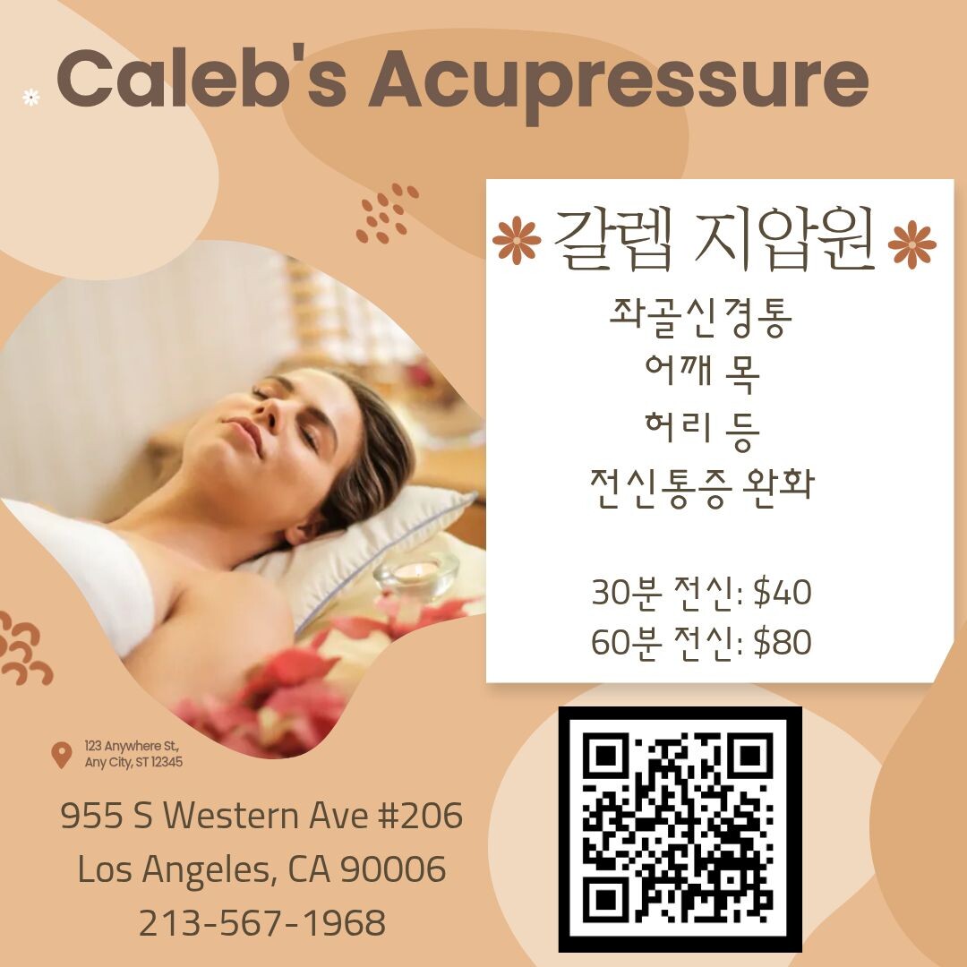 갈렙 지압원이 한인타운 웨스턴과 산마리노 로 이전했습니다.  주차 여유있습니다.