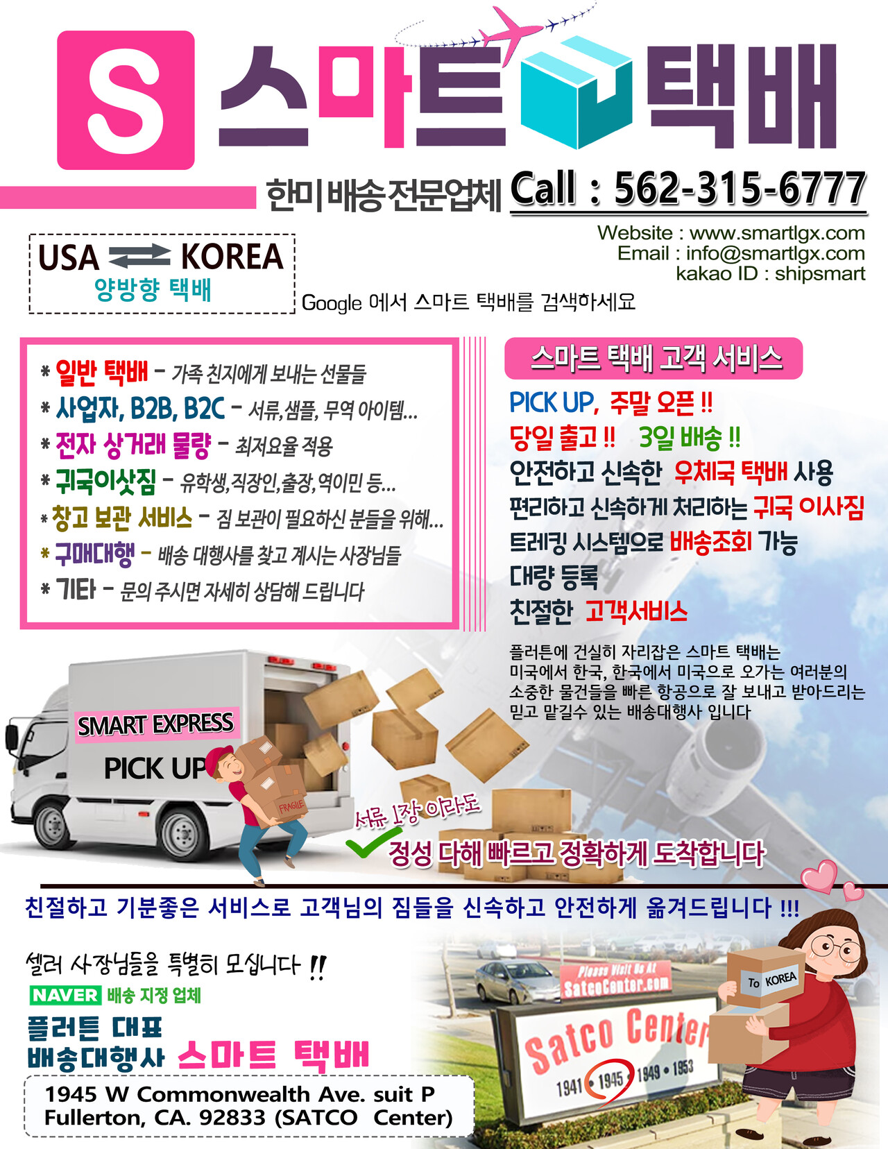 한국으로 보내시거나 한국에서 미국으로 보내실 물건이 있으시면 저희 스마트 택배에서 성심것 도와드리겠습니다