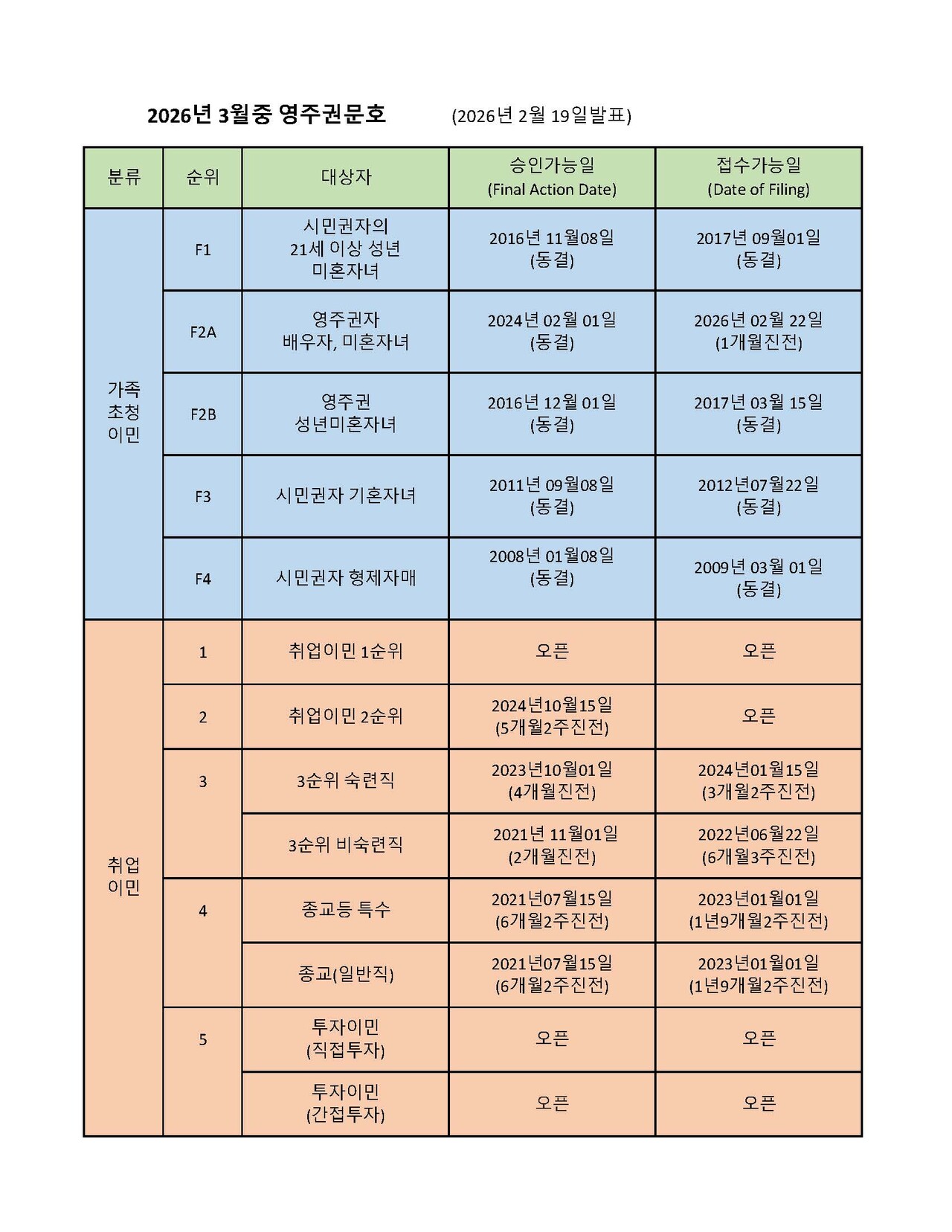 미국 국무부(DOS)는 2월 19일 2026년 3월중 영주권문호(Visa Bulletin)를 발표했습니다. 3월 영주권문호에서는 취업이민 승인가능일(Final Action Date)과 접수가능일(Filing Date)에서 모두 크게 진전이 되었습니다. 가족이민의경우 영주권자배우자와 미성년자녀인 F2A 접수가능일(Filing Date)이 1개월 진전되고 나머지는 모두 동결되었습니다.