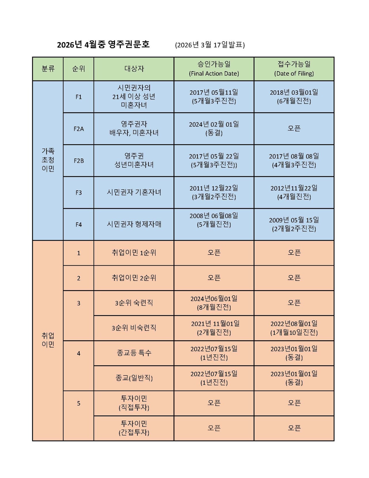 2026년 4월의 영주권 문호에서 시민권자의 21세이상 성년미혼자녀들이 대상인 가족이민 1순위는 승인가능일 (Final Action Date) 이 2017년 5월 11일로 5개월 3주 진전되었으며, 접수가능일 (Filing Date)은 2018년 3월 1일로 6개월진전 되었습니다.