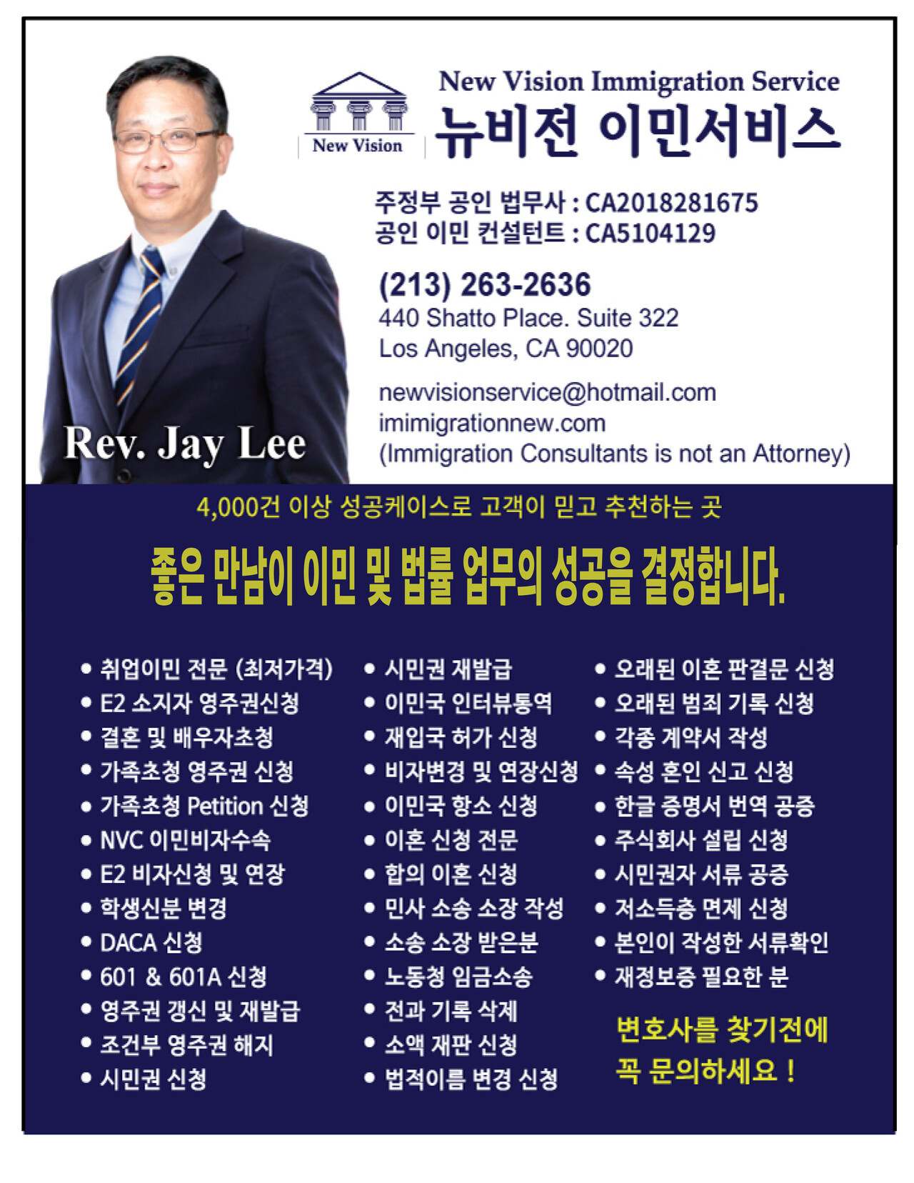 4,000건의 성공 경험으로 법률업무와 모든 이민업무를 가장저렴하게 서비스합니다.