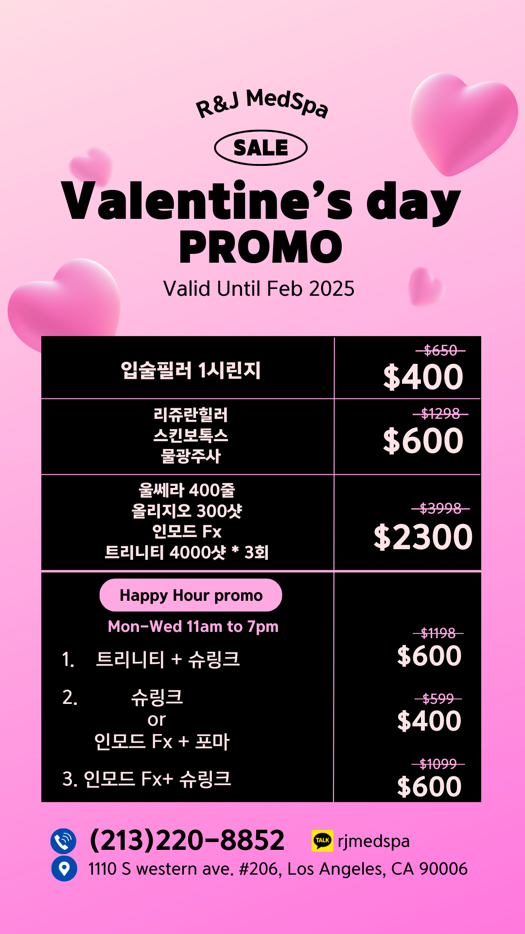 해피아워 이벤트!! 매주 월,화,수 오전 11시에서 오후 7시 사이에 오시면, 슈링크 $400, 인모드 $400에 시술 받으실수 있습니다!!