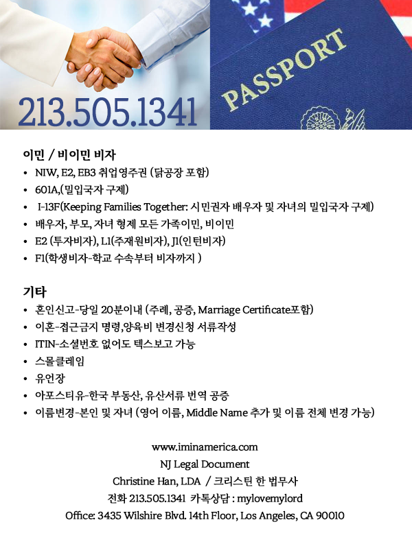 저희 NJ 법률서류 에서는 다른 곳에서 거절 된 케이스나 불가능하다고 했던 모든 이민서류와 법률서류들도 가장 오래된 전문가들이 제대로 정확하게 도와드립니다.