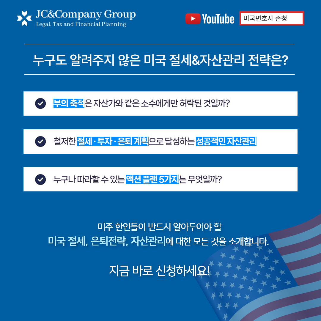 미국 자산관리 전문 로펌 JC&Company가 미주 한인들이 반드시 알아야 할 절세, 은퇴, 자산관리에 대한 명확한 청사진과 '5가지 실행 계획(Action Plan)'을 제시합니다.