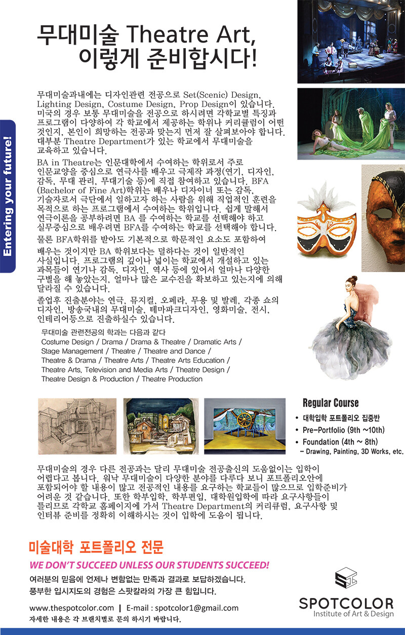 저희 스팟칼라 미술학원의 N. Baik학생이 2025/26년도 무대미술전공으로 UCLA, USC, NYU University등에 합격했습니다.
