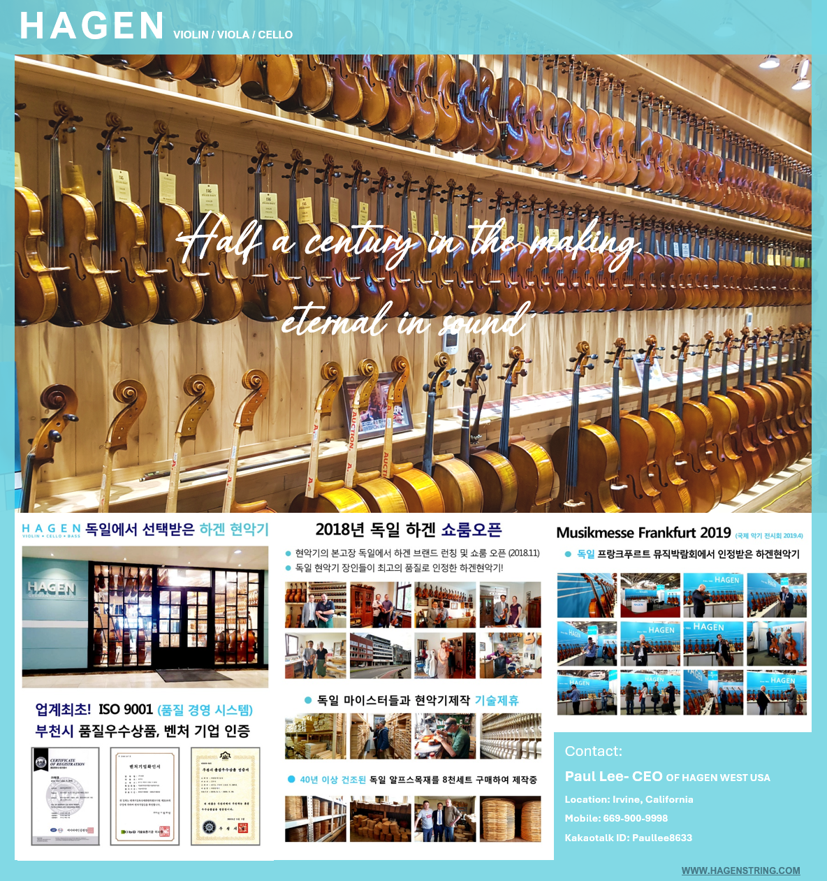 50년 이상 자연 건조된 독일 알프스의 최고급 목재만을 사용하여 제작된 하겐현악기는 깊이 있고 풍부한 울림으로 전 세계 연주자들에게 사랑받고 있습니다.이제 그 하겐의 정교한 사운드와 장인정신을 미국 서부, 남가주 지역에서 직접 만나보실 수 있습니다. 시간이 만들어낸 나무의 깊은 공명, 그리고 독일 장인의 섬세한 손길이 선사하는 완벽한 밸런스, 하겐 현악기는 단순한 악기가 아닌, 예술의 완성입니다.