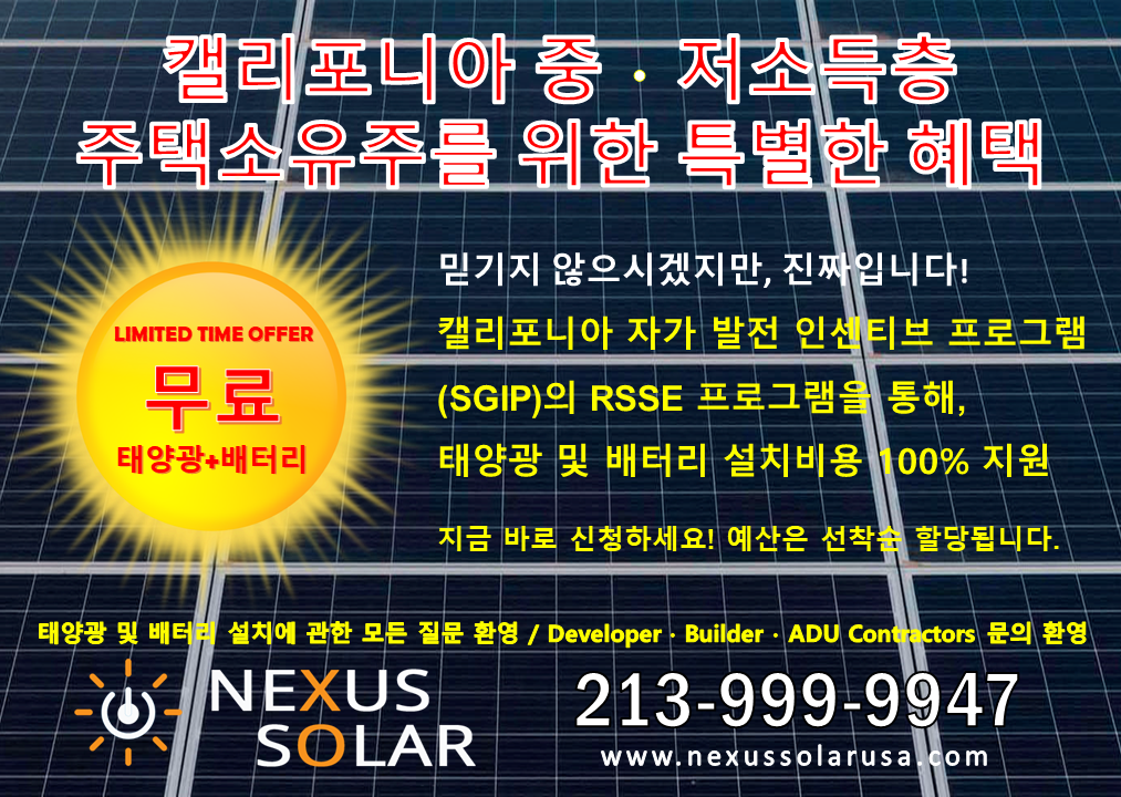 지금 바로 신청하세요! SGIP 프로그램의 예산은 선착순(first-come, first-served)으로 할당되므로, 자격이 되는 경우 최대한 빨리 신청하는 것이 중요합니다. LADWP 지역은 상대적으로 적은 자금으로 인하여 조기마감될수있으니 최대한 빨리 신청하시기를 권장드립니다.