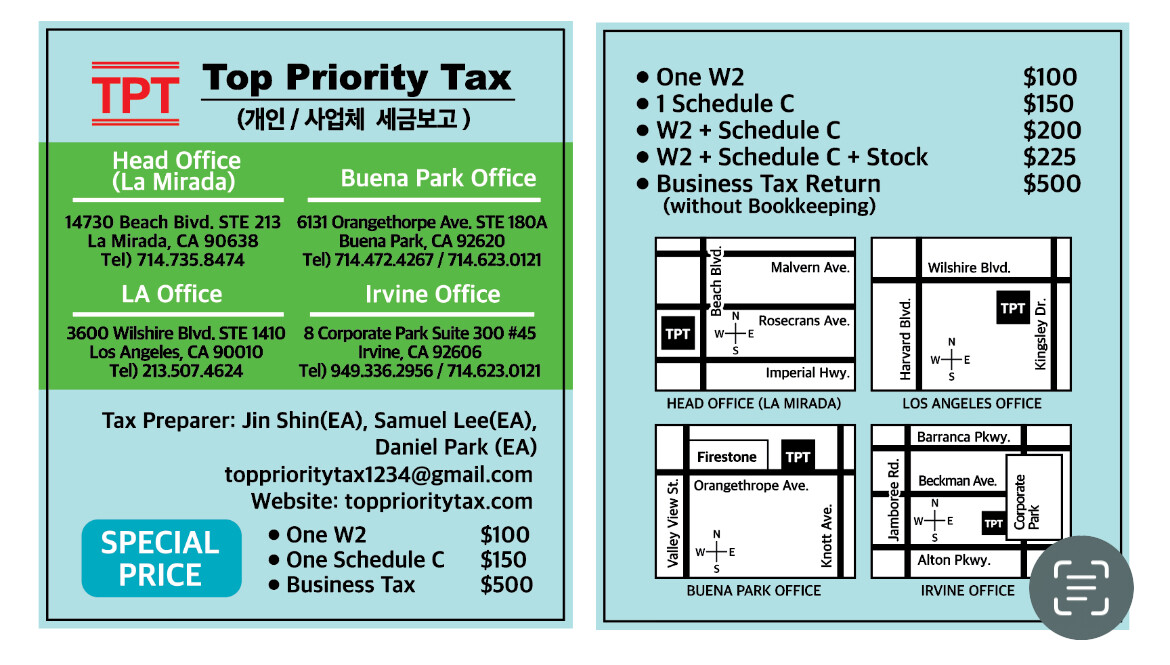 저희 탑프라이어티 Tax는 어려운 경제여건 속에서 개인 또는 비즈니스 세금보고가 서비스 가격대비 만족할 만한 세금서비스를 제공하겠다는 가치아래 고객분들에게 좀 더 다가가는 서비스를 위해 저희 캘리포니아내 각4개지점에서는 여러분들의 Needs에 맞추어 합리적인 가격과 상세하고 친절한 고객상담으로 세금문제 해결을 잘 할 수 있는 시스템을 완벽히 갖추어 놓았습니다.