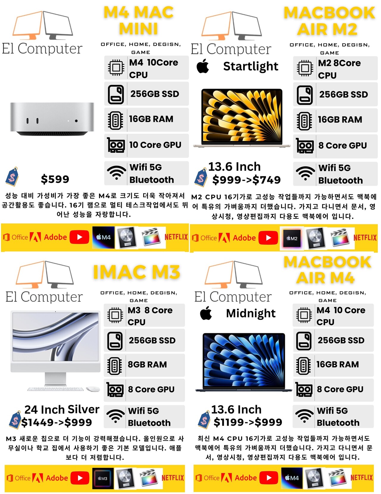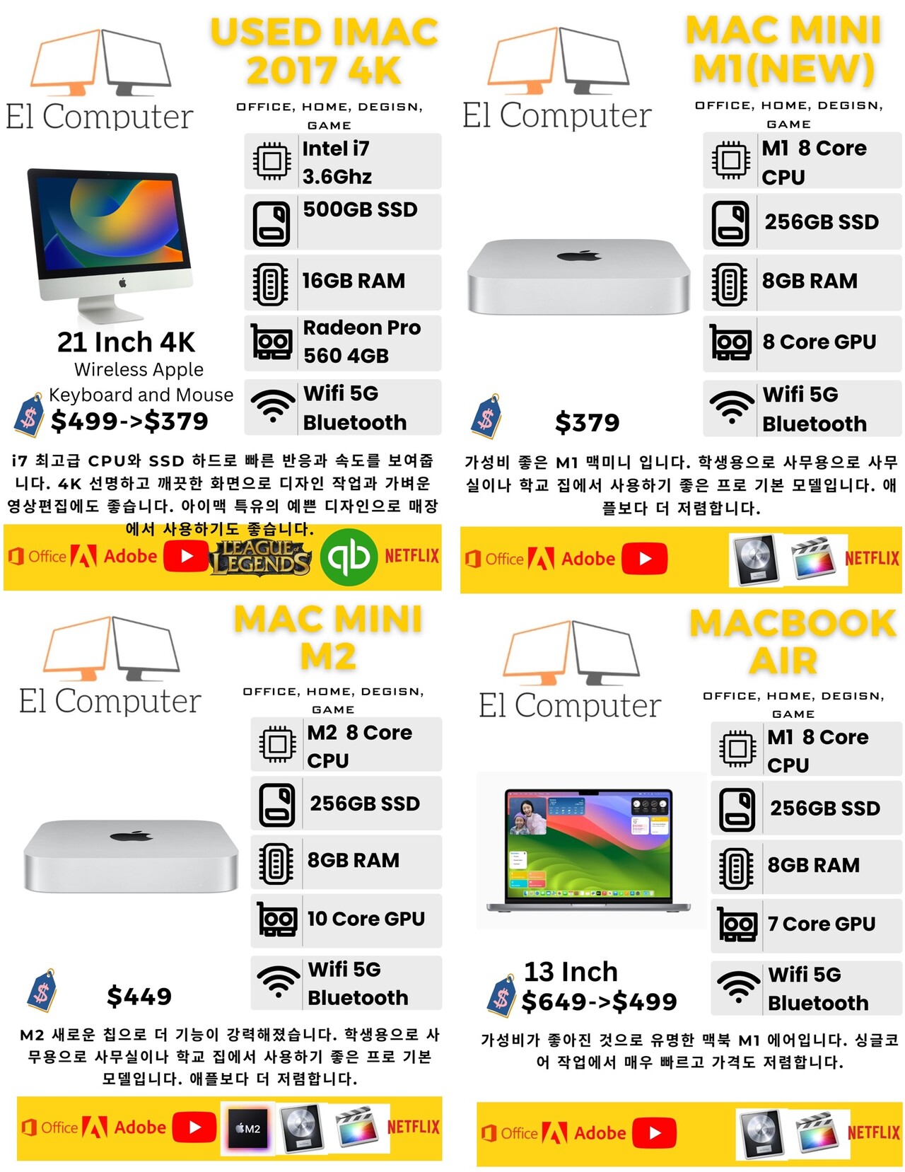 애플 New, 중고 컴퓨터(맥북, 아이맥, 아이패드) 최저가로 판매합니다. 기본프로그램들, 영상, 사진 작업 프로그램들 다 설치되어 있고, 최적화 되어 있습니다. 같은 모델이나 비슷한 사양 링크했습니다. 더 저렴합니다.