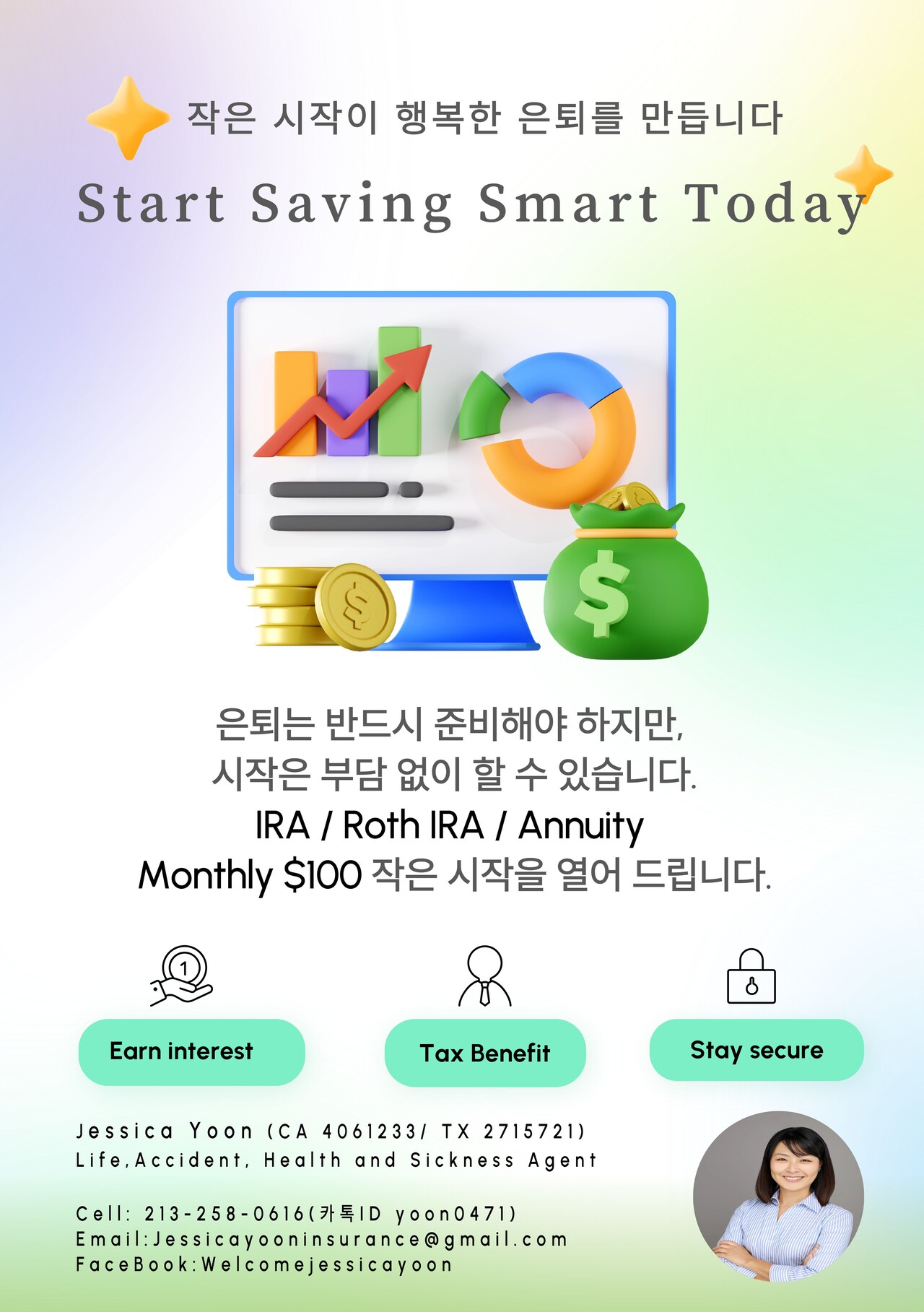 IRA/ Roth IRA /  또는 어뉴이티에 미니멈 한달 $100씩 저축을 시작해 보시는건 어떠신가요?