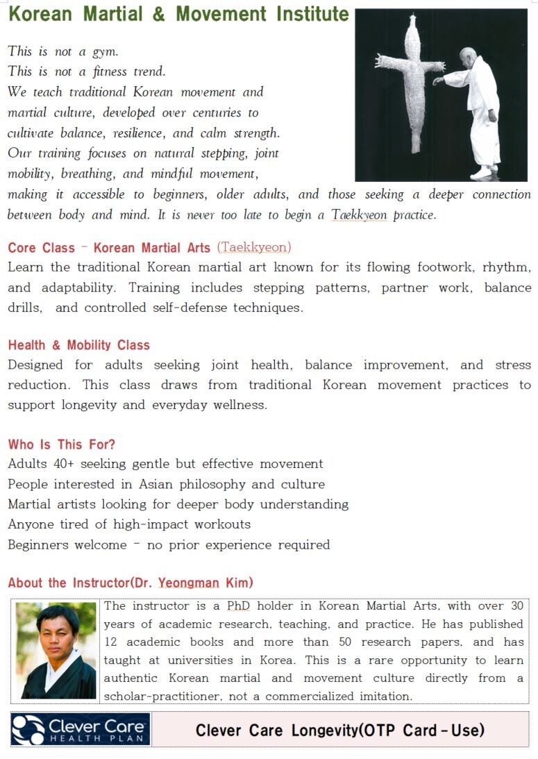 시니어를 위한 한국 무예 & 움직임 수업 회원 모집