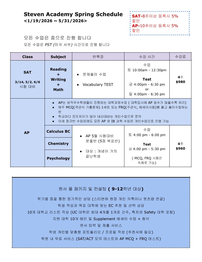 20년 이상 진행해온 봄학기 SAT, AP 정규반 오픈!