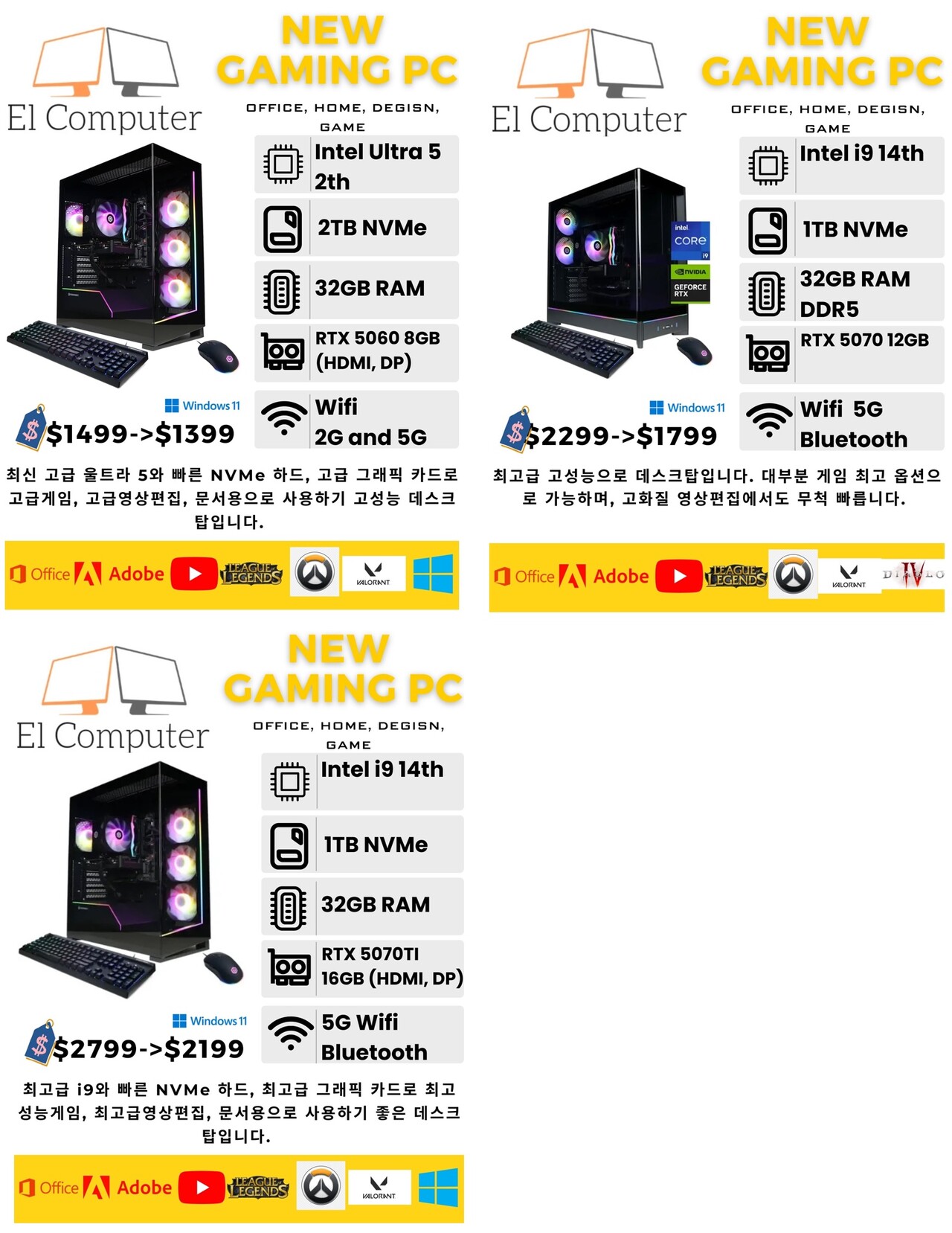 New(데스크탑, 올인원, 랩탑) 최저가로 판매합니다. 기본프로그램들, 영상, 사진 작업 프로그램들 다 설치되어 있고, 최적화 되어 있습니다.