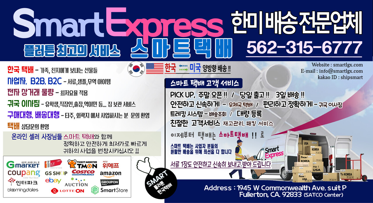 한국으로 보내시거나 한국에서 미국으로 보내실 물건이 있으시면 저희 스마트 택배에서 최저가에 보내드리겠습니다